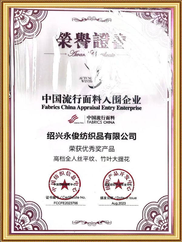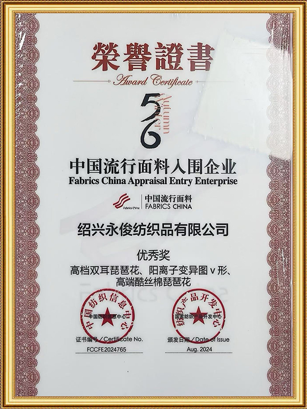 Sejak penubuhannya pada tahun 2003, Yongjun Textile telah mematuhi falsafah korporat "standard tinggi, ketepatan, kelajuan dan inovasi," yang bertujuan untuk meningkatkan kualiti produk dan perkhidmatan. Syarikat itu telah mewujudkan sistem pengurusan kualiti yang lengkap, mengawal ketat setiap peringkat daripada perolehan bahan mentah, pemprosesan pengeluaran, kepada pemeriksaan akhir dan perkhidmatan selepas jualan, memastikan kubu warna, kestabilan, dan prestasi keseluruhan lapisan jacquard PV yang dicelup sekeping. Produknya telah berkembang ke lebih 60 negara dan wilayah di seluruh dunia, memperoleh pengiktirafan daripada pelanggan global untuk prestasi kubu warna mereka.